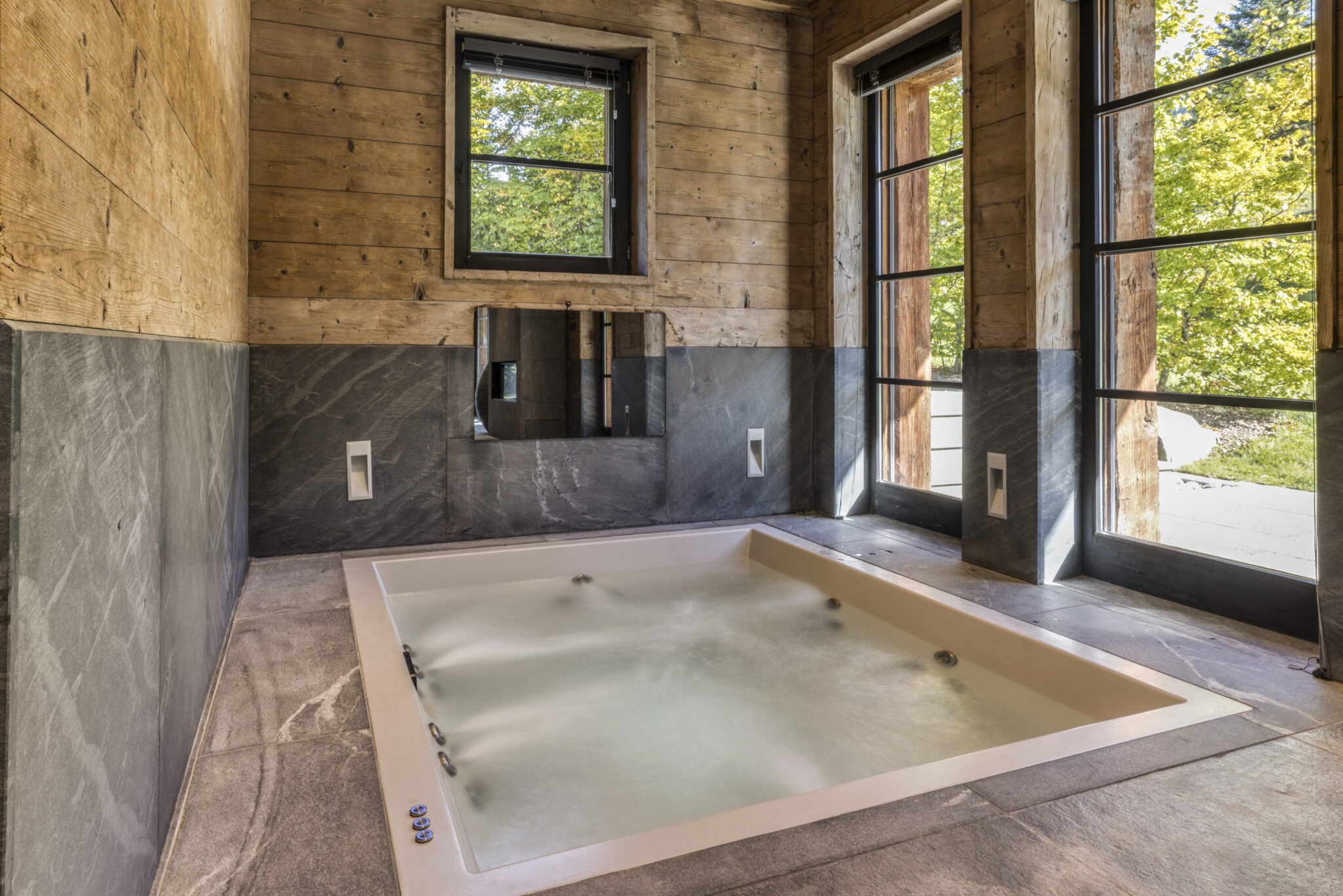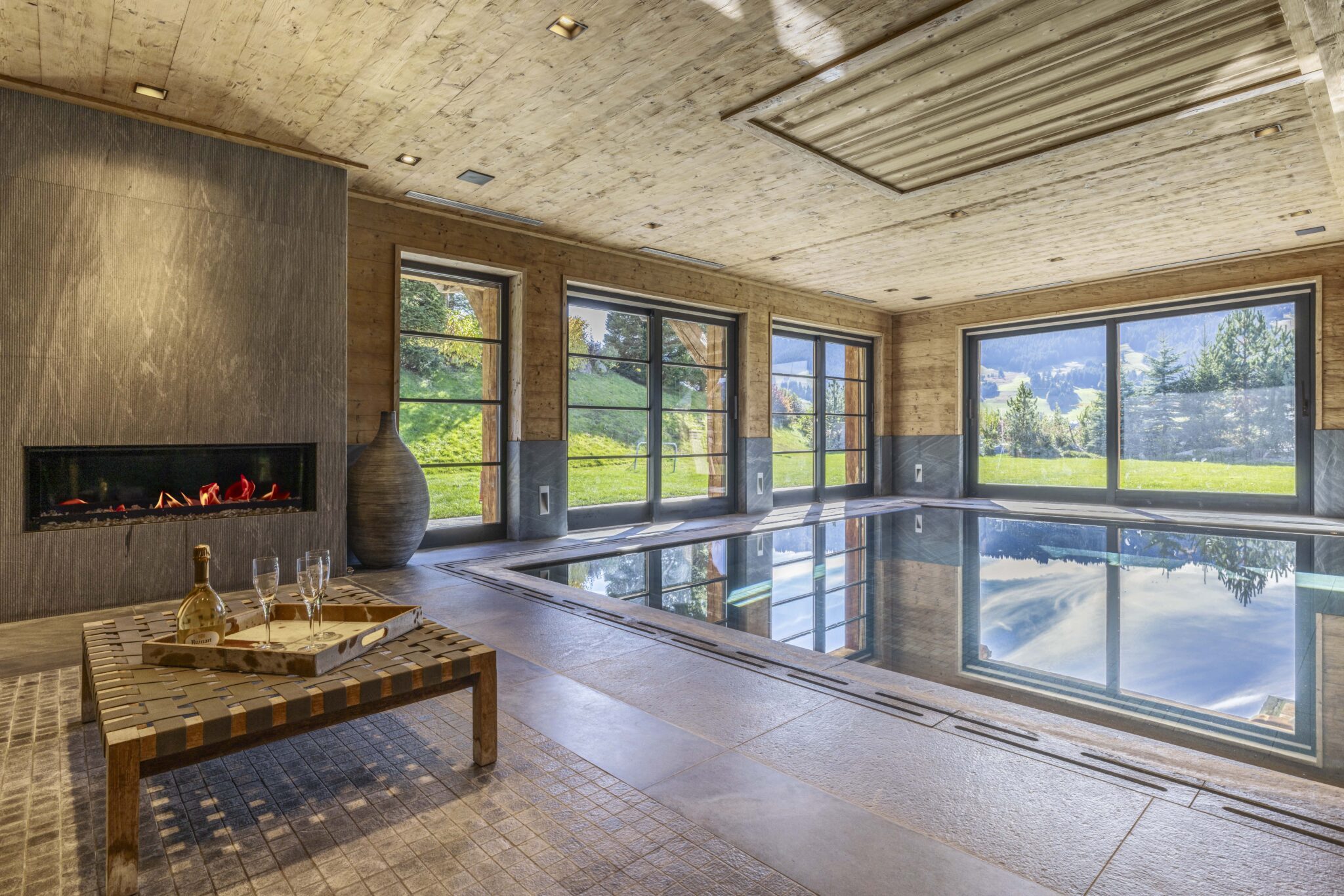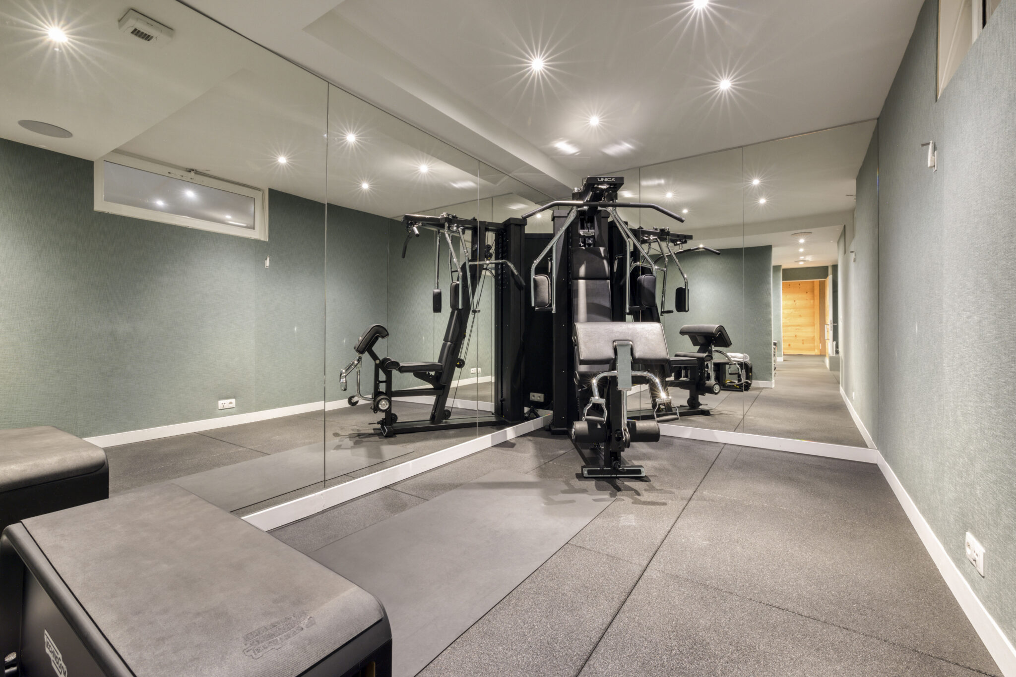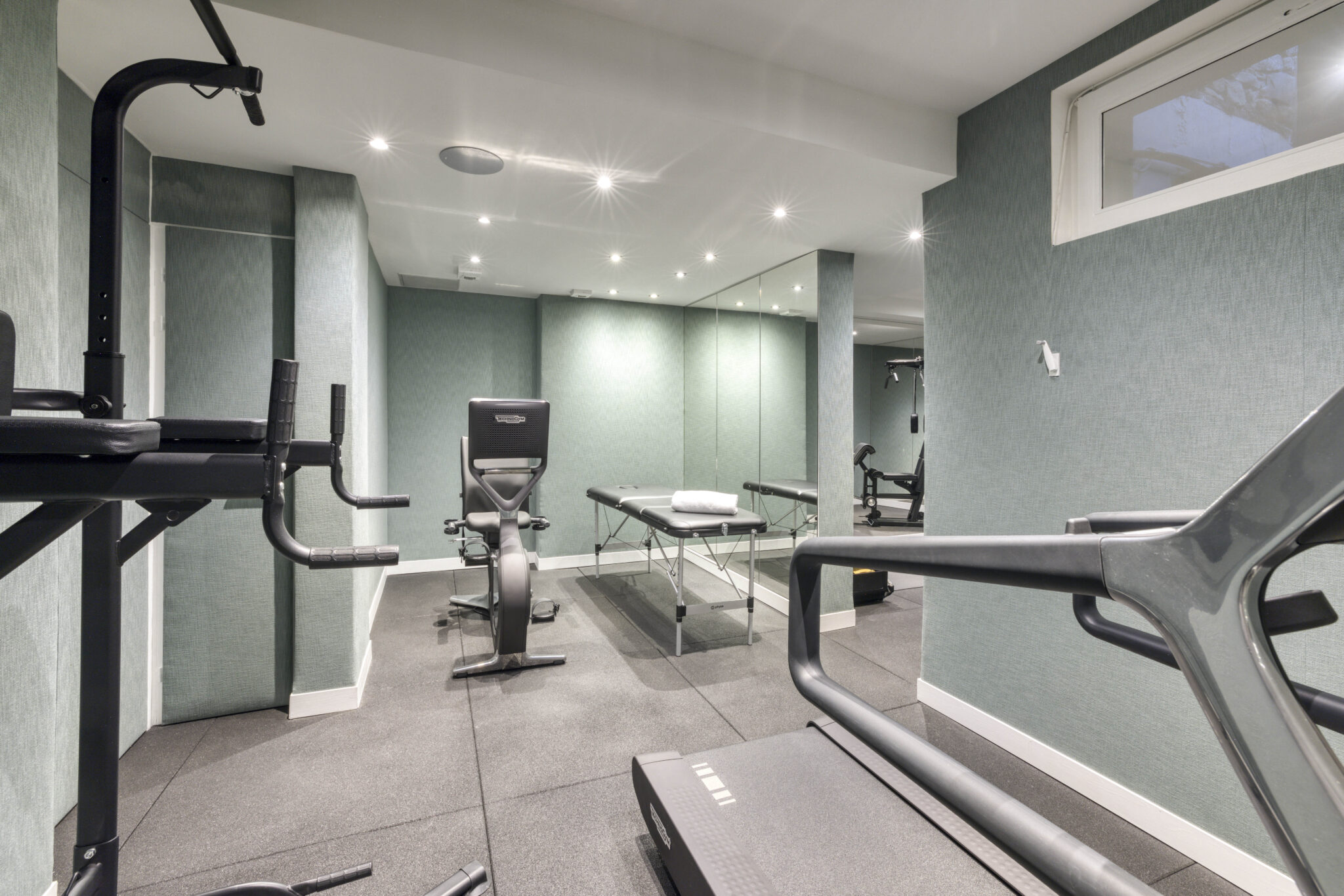 The wellness area is also located on the ground floor and opens onto the outdoor space and garden through numerous bay windows. It includes a beautiful swimming pool with a retractable floor, an ethanol fireplace, a Jacuzzi with a TV, a steam room, a shower and toilets. Completing this area is a massage room and a gym, which are located in the basement on the same level as the cinema room.