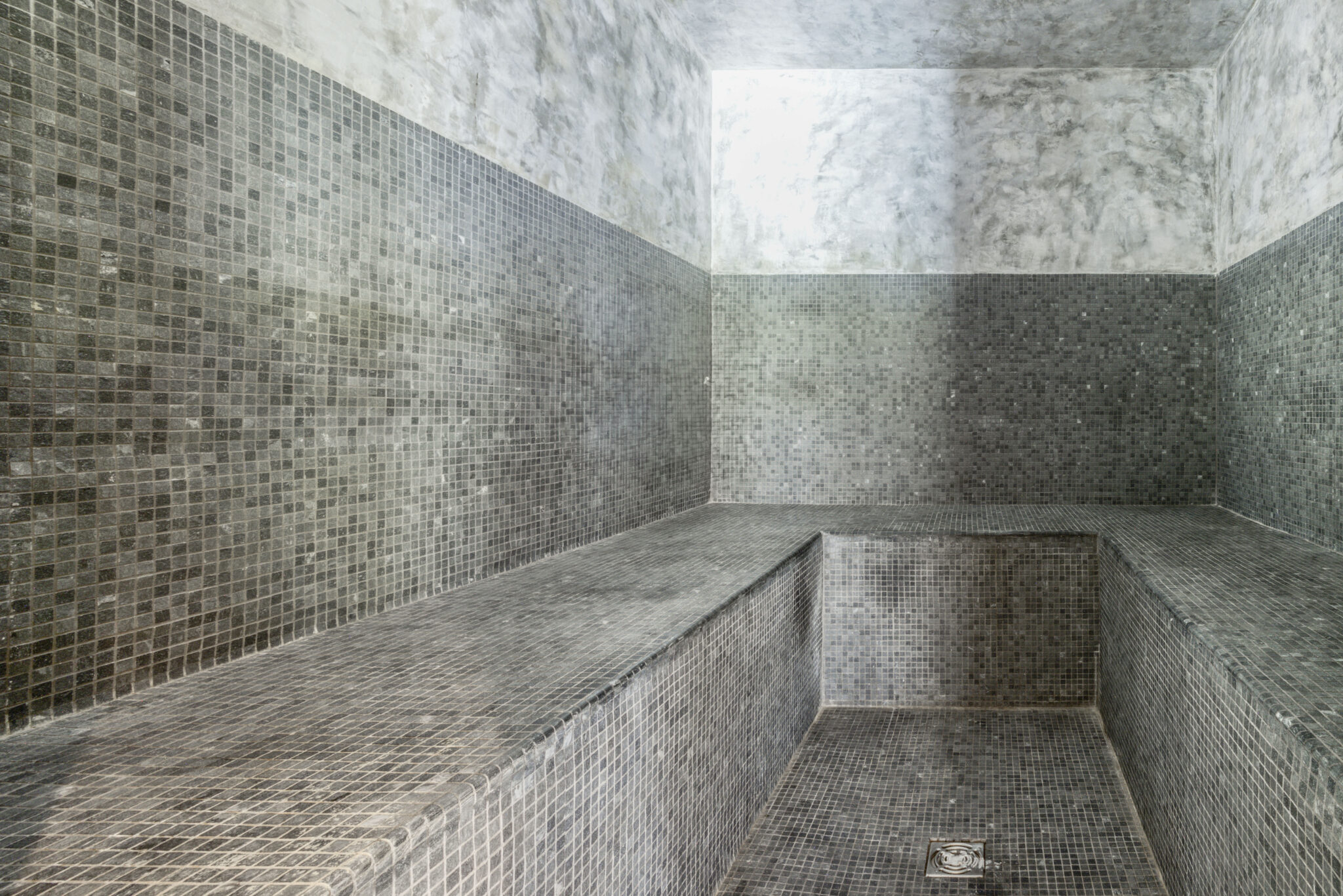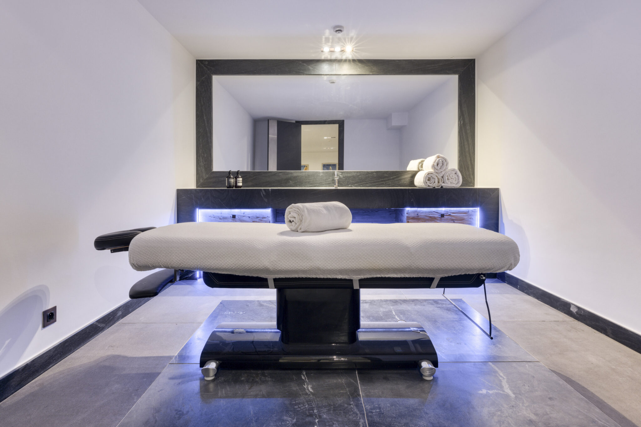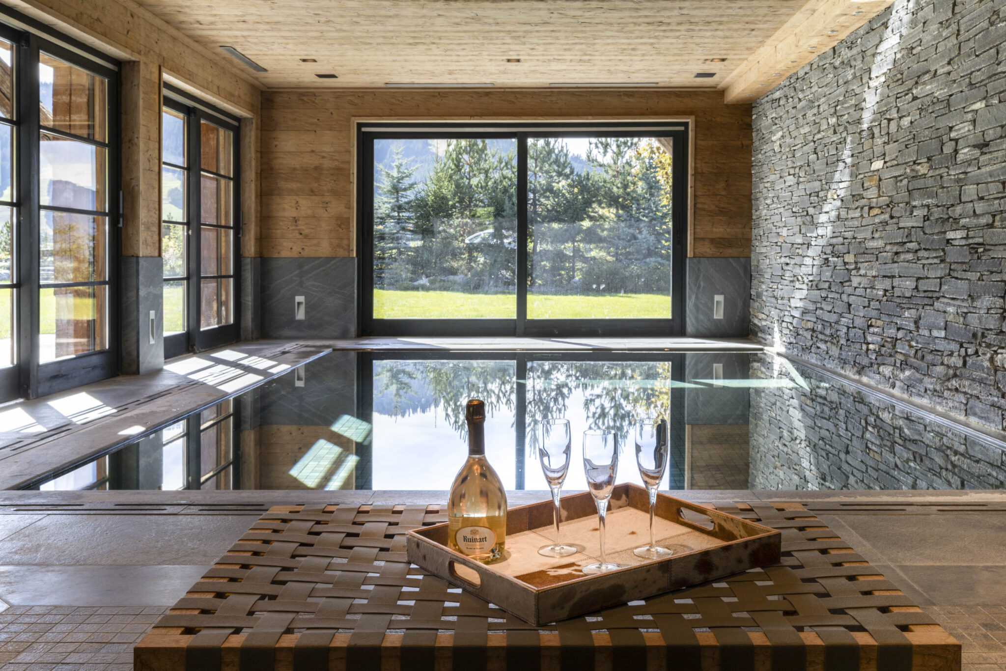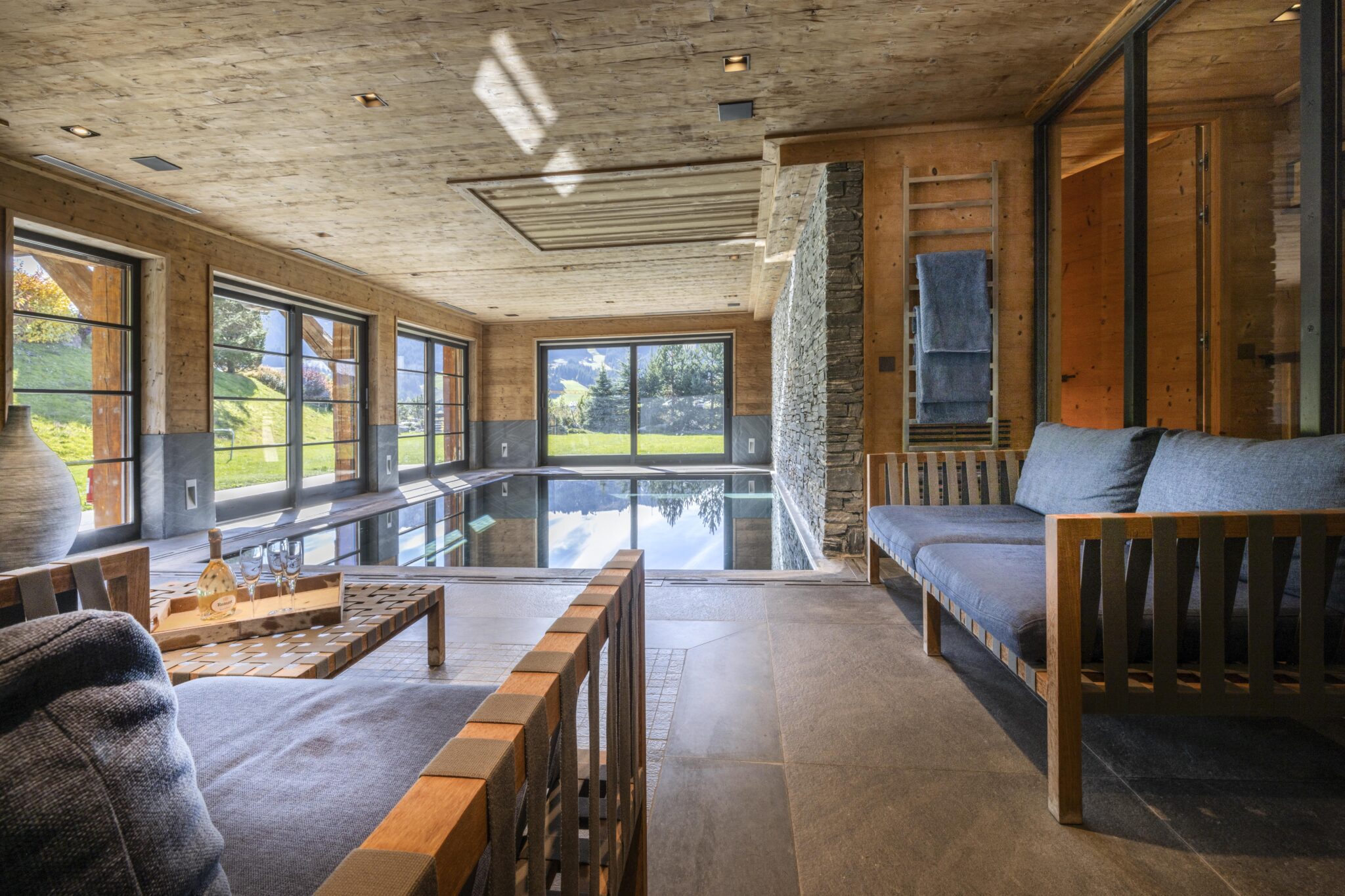 The wellness area is also located on the ground floor and opens onto the outdoor space and garden through numerous bay windows. It includes a beautiful swimming pool with a retractable floor, an ethanol fireplace, a Jacuzzi with a TV, a steam room, a shower and toilets. Completing this area is a massage room and a gym, which are located in the basement on the same level as the cinema room.